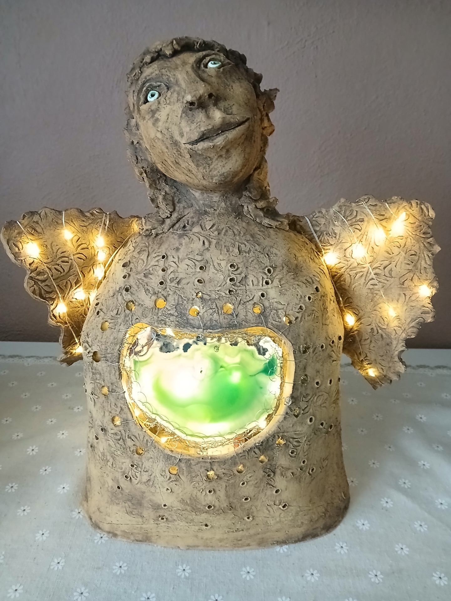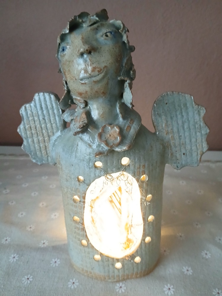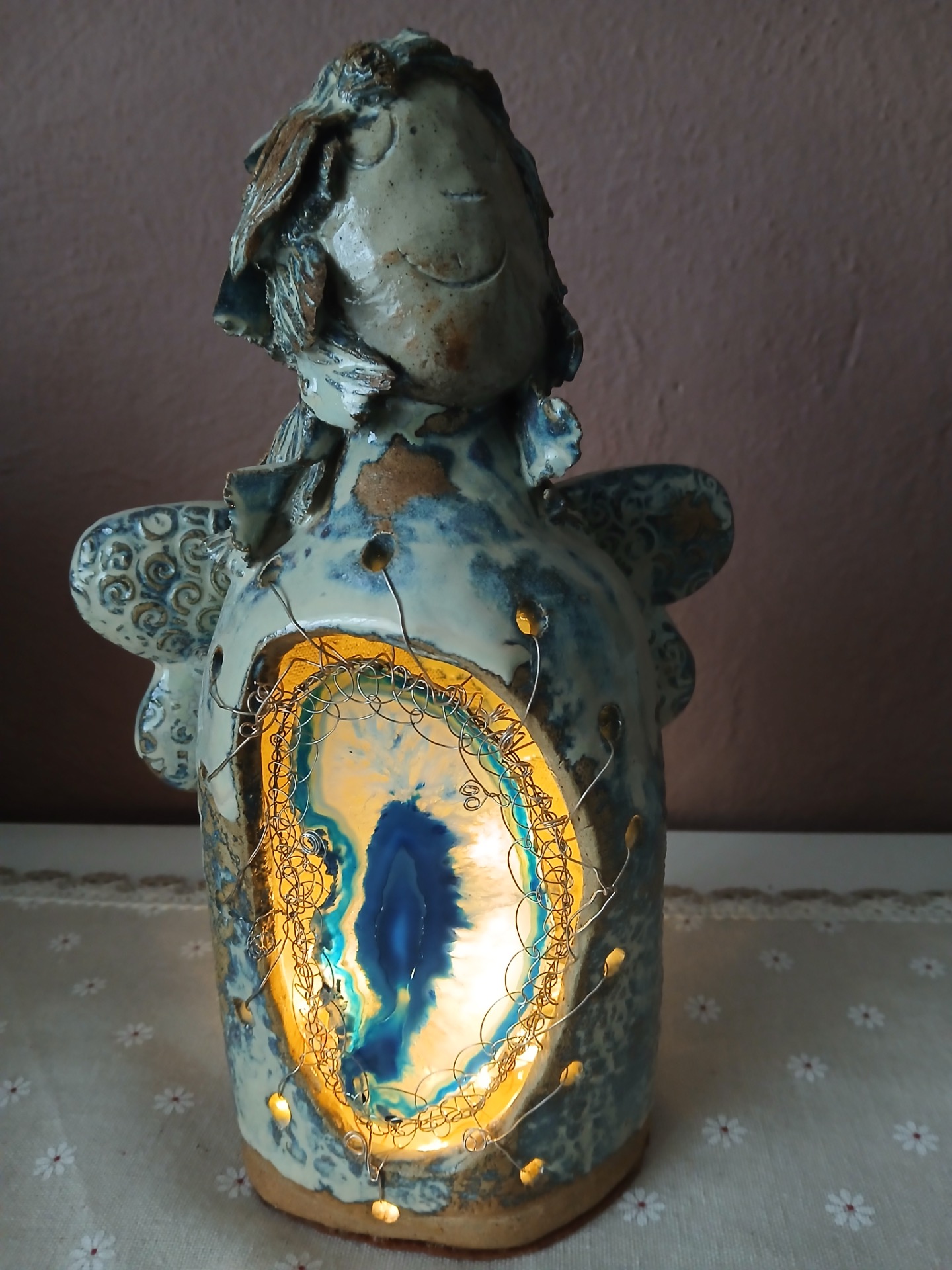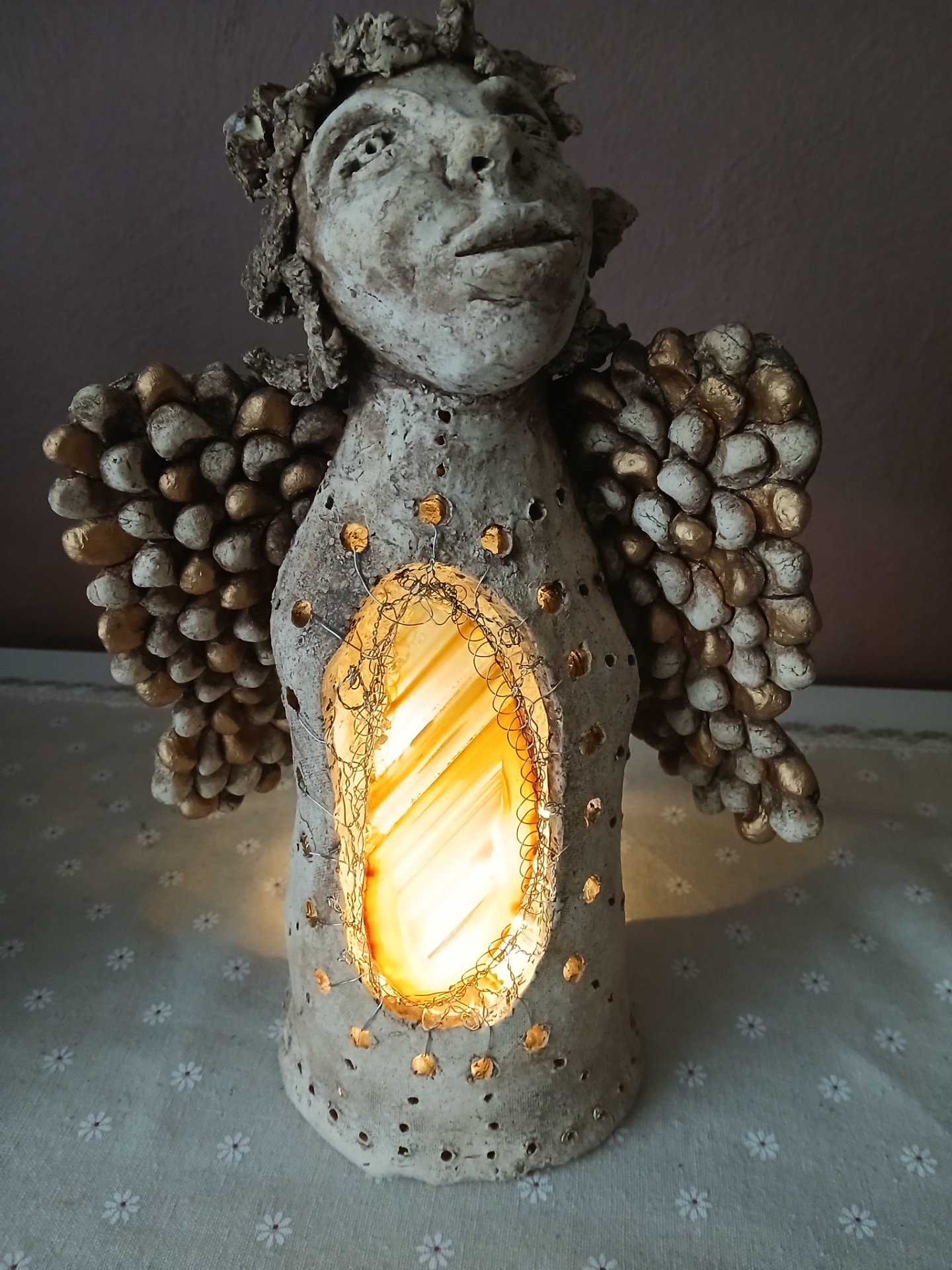 Tohoto anděla jsem vytvářela s myšlenou na zdraví a plodnost. V zeleném achátu můžete vidět zárodek nového života, miminko. Věřím, že tento zasněný anděl vysílá Vaše přání do nebes, které se brzy vyplní.